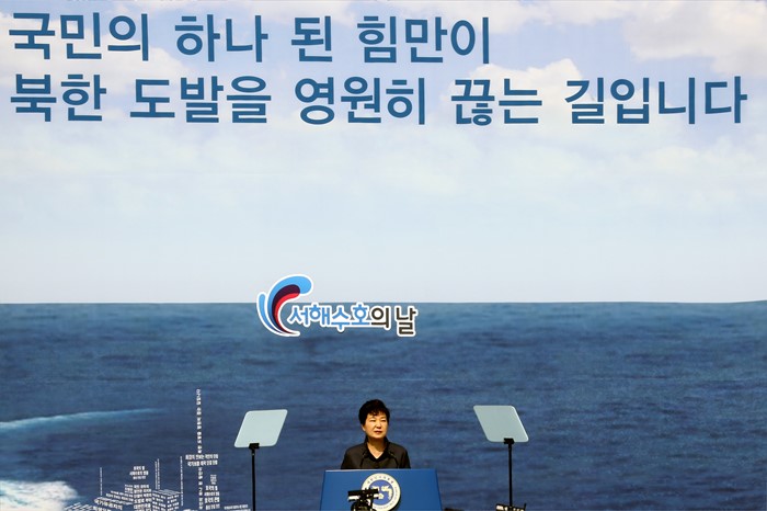 (서울=포커스뉴스) 박근혜 대통령이 25일 오전 국립대전현충원에서 열린 1회 서해수호의 날 기념식에 참석해 기념사를 하고 있다. <사진제공=국가보훈처>