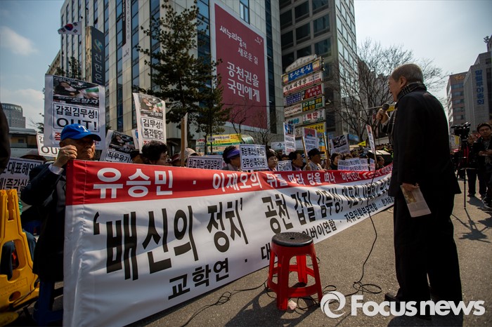 (서울=포커스뉴스) 새누리당이 최고위원회의를 열어 의결이 보류된 5개 지역구에 대한 추인 문제를 논의하고 있는 25일 오후 서울 영등포구 새누리당사 앞에서 어버이연합 관계자들이 '옥새투쟁'을 이어가고 있는 김무성 새누리당 대표의 행동을 규탄 하고 있다.