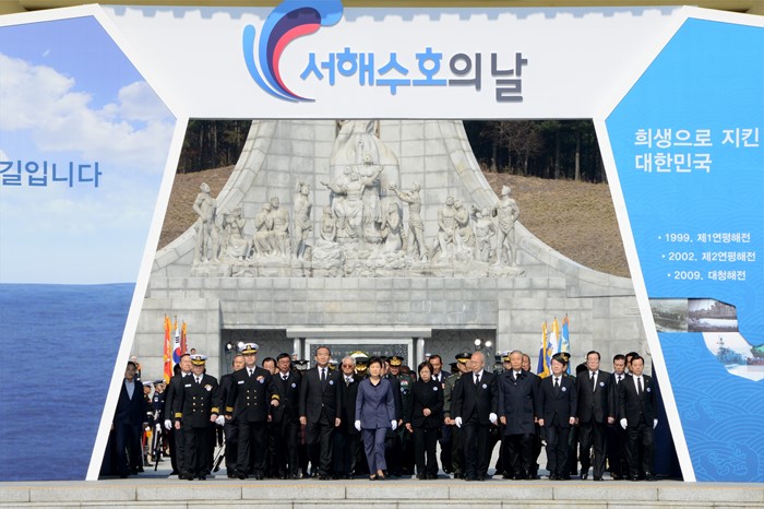(대전=포커스뉴스) 박근혜 대통령이 25일 오전 대전 유성구 국립대전현충원에서 열린 제1회 서해수호의 날 기념식에 참석해 현충탑에 참배 뒤 이동하고 있다. <사진제공=국립대전현충원>