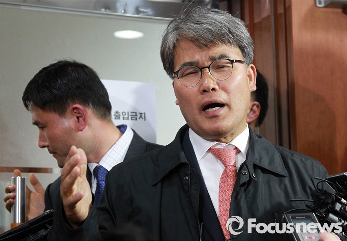 (서울=포커스뉴스) 이재만 새누리당 대구 동을 예비후보가 25일 오후 서울 여의도 당사 회의장 입구에서 최고위원회의 무공천 결정에 대해 자신의 입장을 취재진에게 전하고 있다. 이날 새누리당 최고위는 정종섭(대구 동갑), 추경호(대구 달성), 이인선(대구 수성을) 후보의 공천을 확정했으며, 유영하(서울 송파을), 이재만(대구 동을), 유재길(서울 은평을) 후보는 공천 의결 보류를 확정했다.