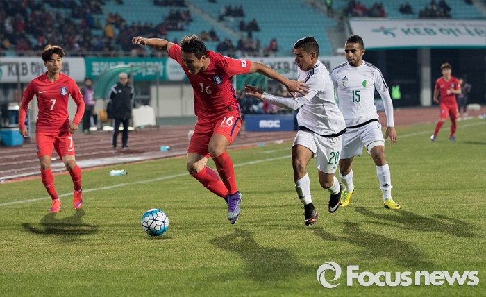 (이천=포커스뉴스) 25일 오후 경기 이천종합운동장에서 열린 KEB하나은행 초청 올림픽대표 대한민국과 알제리의 친선경기에서 전반전 한국 이찬동이 상대선수와 볼다툼을 하고 있다.