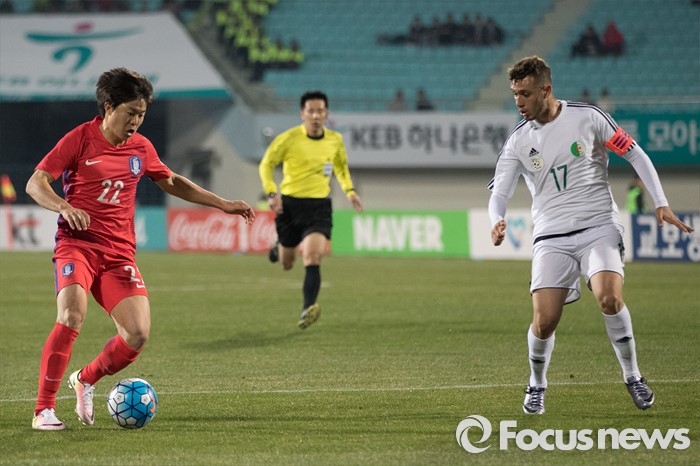 (이천=포커스뉴스) 25일 오후 경기 이천종합운동장에서 열린 KEB하나은행 초청 올림픽대표 대한민국과 알제리의 친선경기에서 전반전 한국 권창훈이 드리블을 하고 있다.