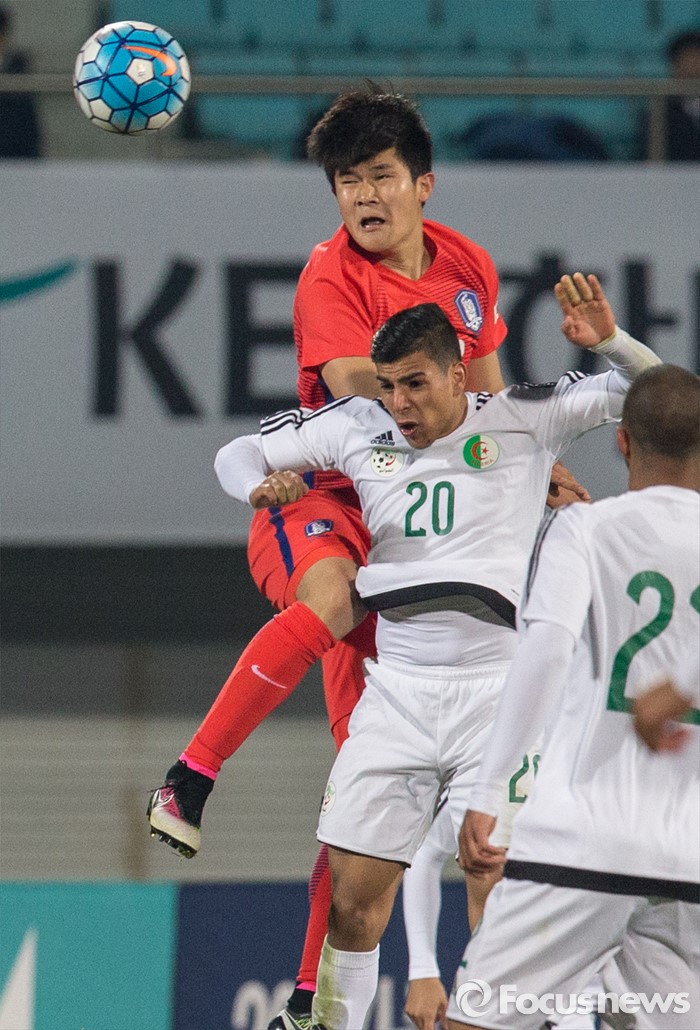 (이천=포커스뉴스) 25일 오후 경기 이천종합운동장에서 열린 KEB하나은행 초청 올림픽대표 대한민국과 알제리의 친선경기에서 후반전 한국 김민재가 상대선수와 공중볼을 다투고 있다.