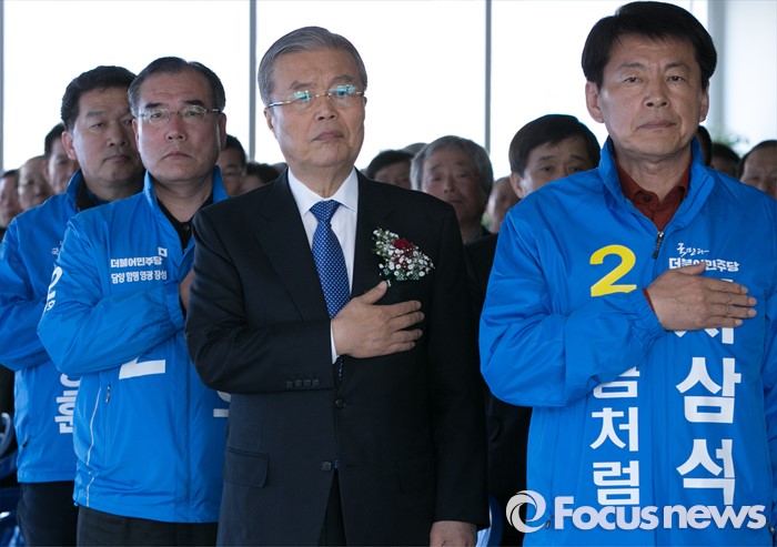 (무안=포커스뉴스) 26일 오후 전남 무안군에서 열린 서삼석 더불어민주당 전남 영암·무안·신안군 후보 선거사무소 개소식에 참석한 김종인 비대위 대표와 내빈들이 국기에 대한 경례를 하고 있다. 앞줄 왼쪽부터 신정훈, 이개호 의원, 김 대표, 서 후보.