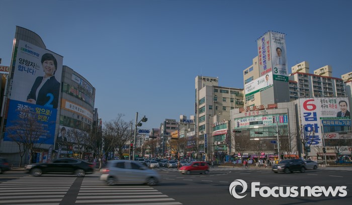 (광주=포커스뉴스) 야권의 호남쟁탈전이 벌어질 것으로 예상되는 20대 총선을 보름여 앞으로 다가온 26일 오후 광주 서구 풍금사거리에서 각 정당 후보들의 선거사무소 현수막이 보이고 있다.