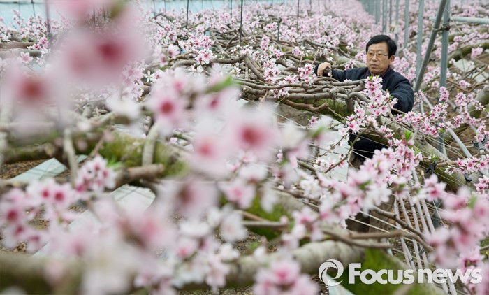 기상청은 "당분간 낮기온은 평년과 비슷하거나 조금 높아 포근하겠으나, 일교차가 10도 내외로 크니 건강관리에 유의하기 바란다"고 말했다.(세종=포커스뉴스) 포근한 날씨를 보인 12일 오후 세종시 연동면 예양리 복숭아 하우스에서 농민이 만개한 복사꽃을 살펴보고 있다. 2016.02.12 김기태 기자