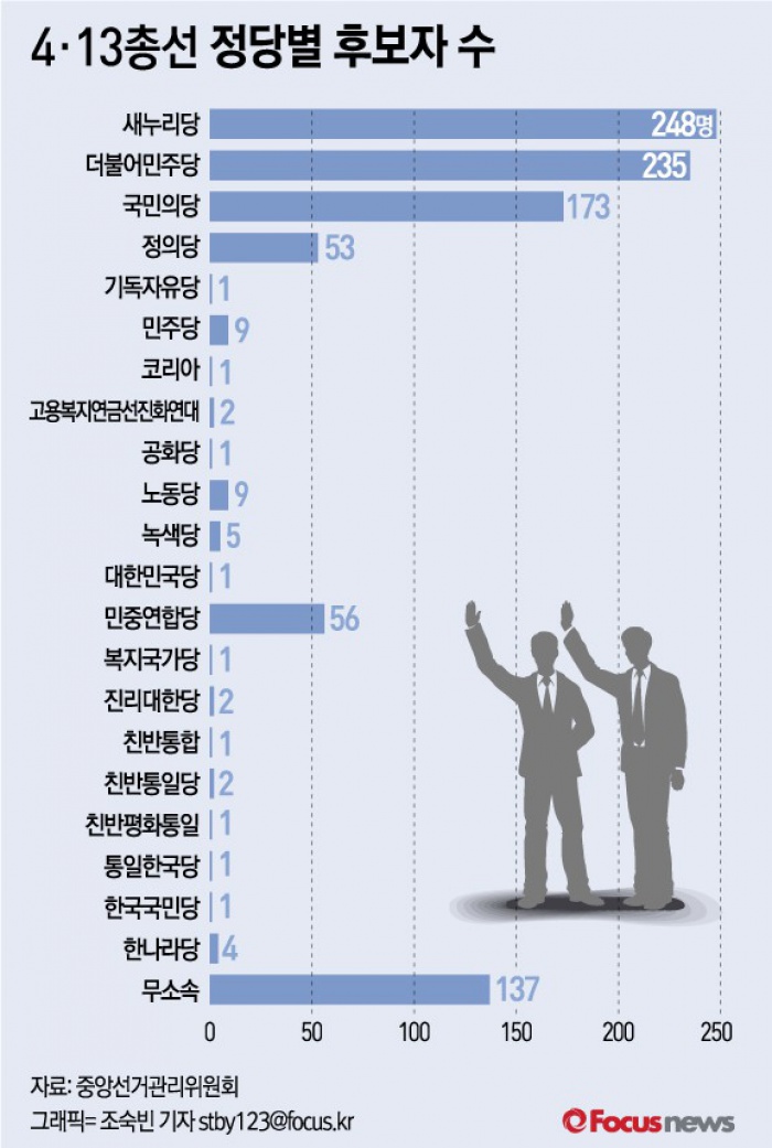 (서울=포커스뉴스) 오는 4·13 국회의원 선거를 앞두고 24일부터 25일까지 진행된 국회의원 후보자 등록 결과, 총 944명의 후보자가 등록을 마쳤다.