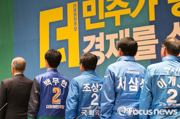 (광주=포커스뉴스) 김종인 더불어민주당 비대위 대표가 27일 오전 광주 서구 김대중컨벤션센터에서 열린 더불어민주당 경제살리기 광주·전남 20대 총선 후보자 연석회의에 참석해 후보자들과 국기에 대한 경례를 하고 있다.
