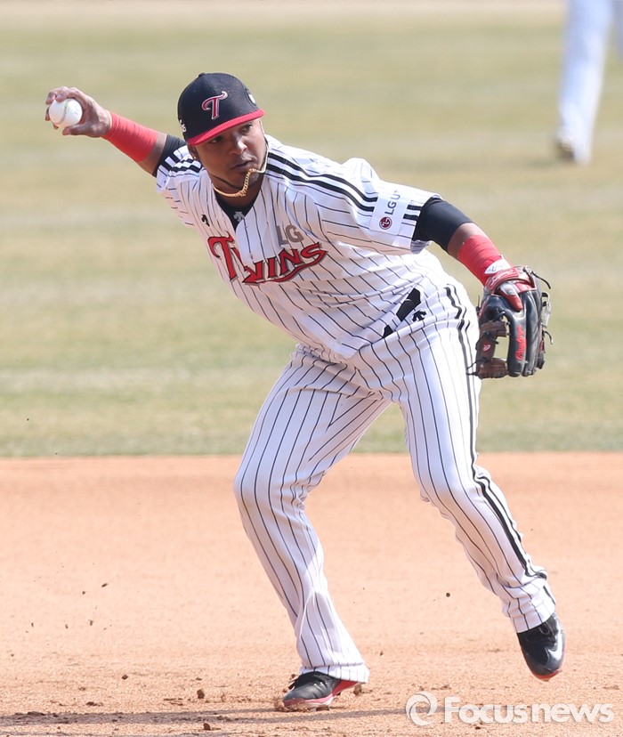 (서울=포커스뉴스) 27일 서울 잠실구장에서 열린 2016프로야구 시범경기 두산-LG 경기에서 LG 3루수 히메네스가 7회 두산 오재원의 타구를 잡아 1루로 송구하고 있다.