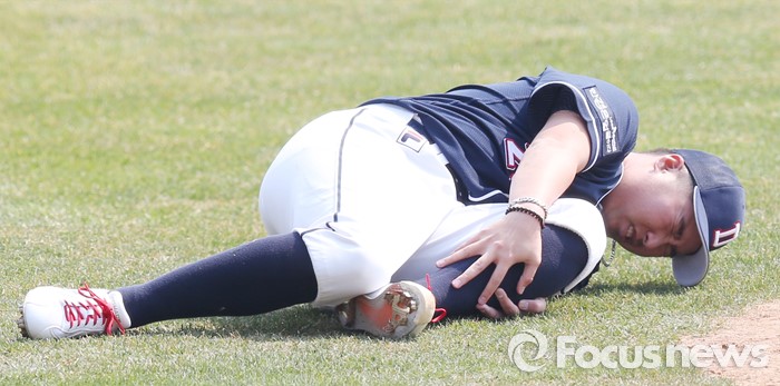 (서울=포커스뉴스) 27일 서울 잠실구장에서 열린 2016프로야구 시범경기 두산-LG 경기에서 5회말 LG 채은성의 타구에 왼쪽 정강이를 맞은 두산 투수 유희관이 그라운드에 넘어진채 고통스러워하고 있다.