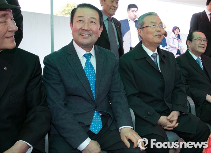 (광주=포커스뉴스) 김종인(오른쪽 두번째) 더불어민주당 비대위 대표와 박주선(왼쪽 두번째) 국민의당 최고위원이 27일 오후 광주광역시청 문화광장에서 열린 2016 부활절 연합예배에 앞서 내빈대기실에서 만나 대화한 뒤 서로 다른 곳을 보고 있다.