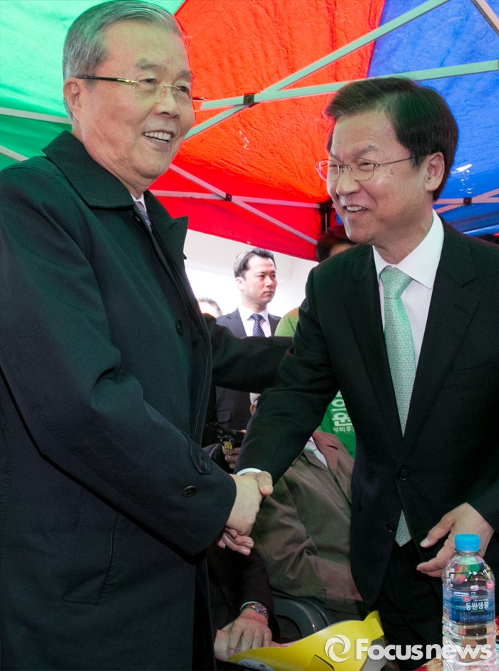 (광주=포커스뉴스) 김종인(왼쪽) 더불어민주당 비대위 대표와 천정배 국민의당 공동대표가 27일 오후 광주광역시청 문화광장에서 열린 2016 부활절 연합예배에 앞서 내빈대기실에서 만나 악수하고 있다.