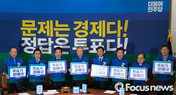 (서울=포커스뉴스) 김종인 더불어민주당 비대위 대표 겸 선대위원장과 참석자들이 27일 오전 서울 여의도 국회에서 열린 중앙선거대책위원장단회의에 참석해 피켓을 들고 구호를 외치고 있다. 왼쪽부터 최운열 국민경제상황실장, 전병헌(서울), 김진표(경기) 부위원장, 김 위원장, 진영(서울), 이근식(서울), 최동익(장애인), 김홍걸(광주) 부위원장.
