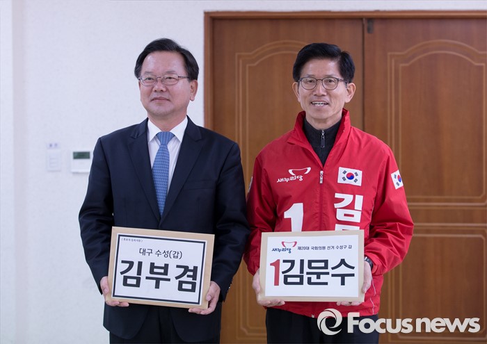 이번 조사는 대구 수성갑 선거구의 유권자 500명을 대상으로 한국전화번호부(주)의 전수 전화번호 DB를 활용해 가구유선전화를 전화면접조사(CATI)로 실시됐으며 오차범위는 95% 신뢰수준에서 ±4.4%이다. 이번 여론조사에 대한 자세한 내용은 중앙선거여론조사공정심의위원회 홈페이지(www.nesdc.go.kr)에서 찾아볼 수 있다.(대구=포커스뉴스) 24일 오전 대구 수성구 선거관리위원회에서 김문수(오른쪽) 새누리당 전 의원과 김부겸 더불어민주당 전 의원이 20대 총선 국회의원 후보 등록에 앞서 기념촬영을 하고 있다. 2016.03.24 김인철 기자