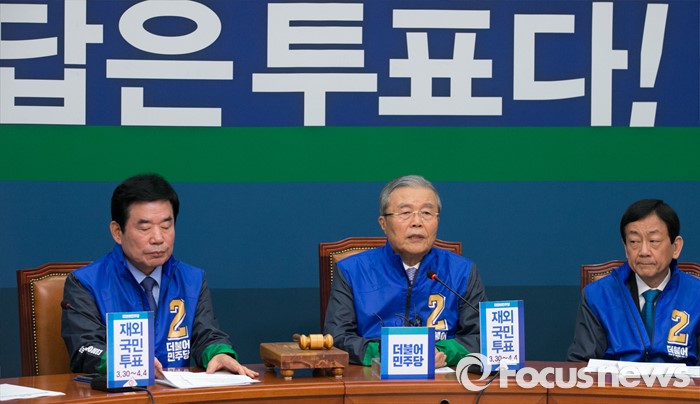 (서울=포커스뉴스) 김종인 더불어민주당 비대위 대표 겸 선대위원장이 27일 오전 서울 여의도 국회에서 중앙선거대책위원장단회의에 앞서 재외선거 독려 발언을 하고 있다. 왼쪽부터 김진표 부위원장, 김 위원장, 진영 부위원장.