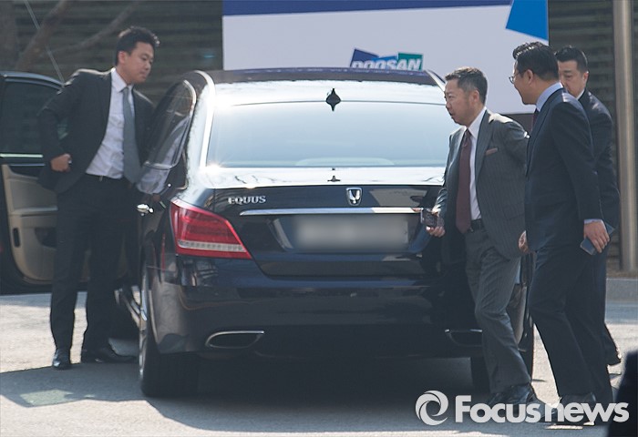 (서울=포커스뉴스) 박정원(왼쪽 두번째) 신임 두산그룹 회장이 28일 오전 서울 강동구 두산연강원에서 열린 두산그룹 회장 취임식에 참석하기 위해 차에서 내리고 있다.