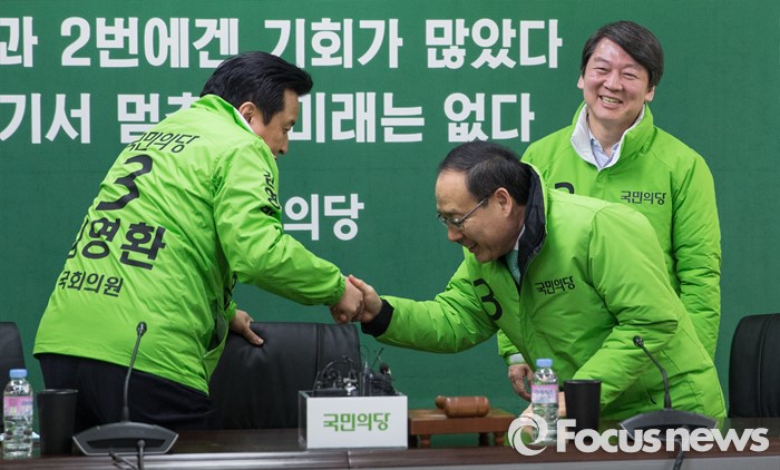 (서울=포커스뉴스) 안철수 국민의당 대표(오른쪽)와 오세정 공동선거대책위원장, 김영환 공동선거대책위원장(왼쪽)이 28일 서울 마포구 당사에서 열린 선거대책위원회의에서 서로 자리를 양보하고 있다.