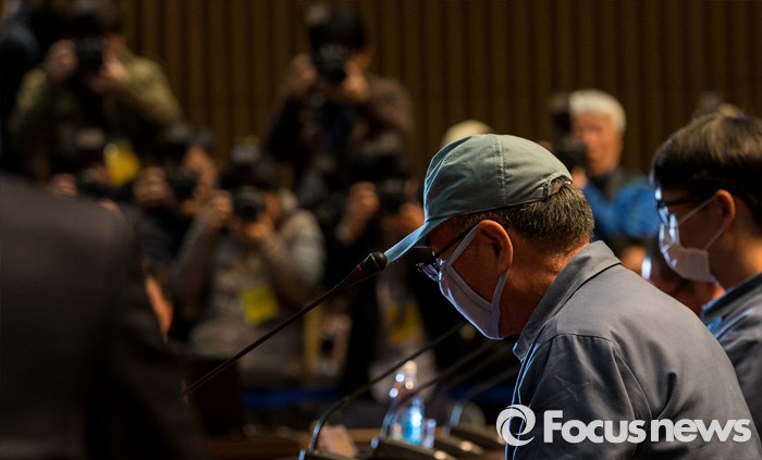 (서울=포커스뉴스) 28일 오전 서울시청 다목적홀에서 세월호 참사 특별조사위원회의 제2차 청문회가 열렸다. 이날 청문회에 증인으로 참석한 이준석 선장이 증인석으로 향하고 있다.