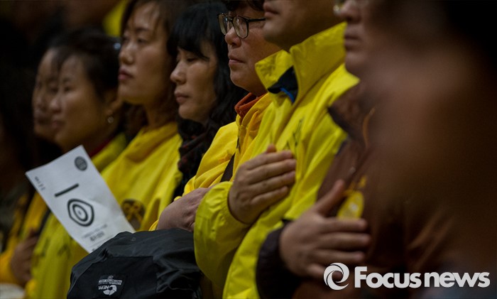 (서울=포커스뉴스) 28일 오전 서울시청 다목적홀에서 세월호 참사 특별조사위원회의 제2차 청문회가 열렸다. 이날 청문회에 참석한 세월호 참사 유가족들이 국민의례를 하고 있다.