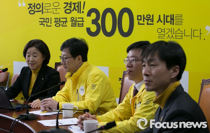 (서울=포커스뉴스) 심상정(왼쪽 첫번째) 정의당 상임선대위원장과 천호선(왼쪽 두번째) 공동선대위원장이 28일 오전 서울 여의도 국회에서 열린 중앙선대위 회의에 참석해 '정의로운 가계부' 소개 및 시연 행사를 하고 있다.