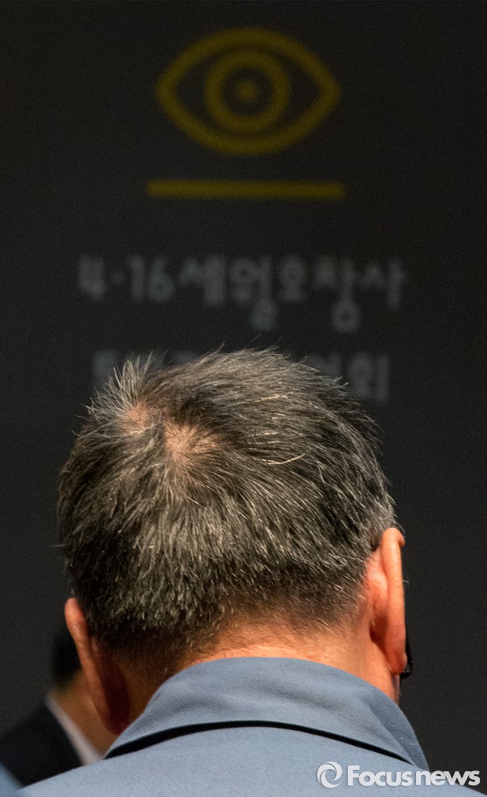 (서울=포커스뉴스) 28일 오전 서울시청 다목적홀에서 세월호 참사 특별조사위원회의 제2차 청문회가 열렸다. 이날 청문회에 증인으로 참석한 이준석 선장 앞으로 세월호 특조위 로고가 보이고 있다.