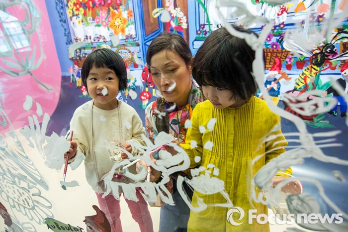 (서울=포커스뉴스) 28일 오전 서울 송파구 롯데백화점 잠실점 에비뉴엘 아트홀에서 열린 '러블리 레테' 전시회에서 프랑스 작가 나탈리 레테가 어린이들과 라이브페인팅을 하고 있다.
