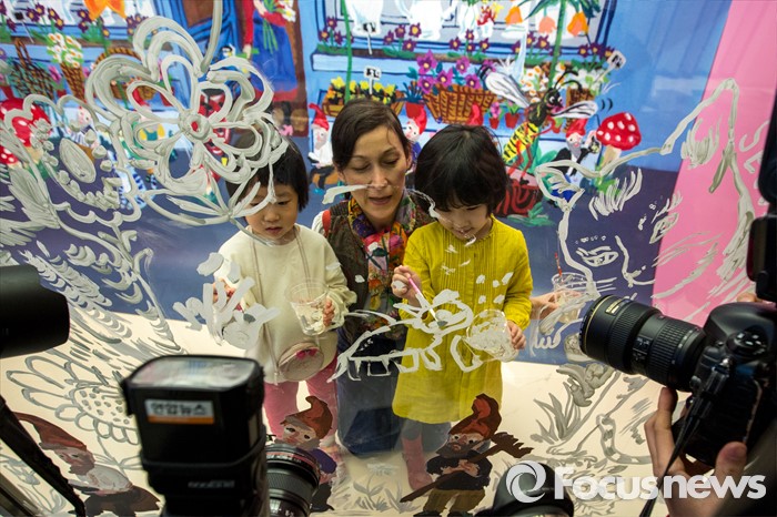 (서울=포커스뉴스) 28일 오전 서울 송파구 롯데백화점 잠실점 에비뉴엘 아트홀에서 열린 '러블리 레테' 전시회에서 프랑스 작가 나탈리 레테가 어린이들과 라이브페인팅을 하고 있다.