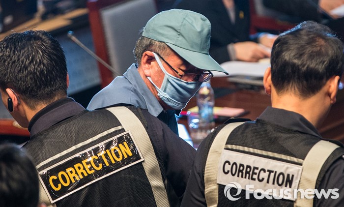 (서울=포커스뉴스) 28일 오전 서울시청 다목적홀에서 세월호 참사 특별조사위원회의 제2차 청문회가 열렸다. 이날 청문회에 증인으로 참석한 이준석 선장이 정회 후 청문회장을 빠져나가고 있다.