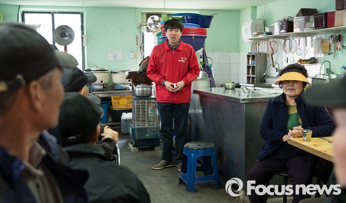 (서울=포커스뉴스) 이준석 새누리당 노원병 후보가 28일 오후 서울 노원구 당고개역 인근의 한 식당에서 선거 유세를 하고 있다.