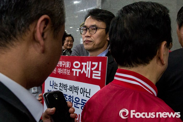 (서울=포커스뉴스) 새누리당의 무공천 결정으로 4.13 총선 서울 은평을 출마가 무산된 유재길 예비후보가 28일 오후 20대 총선 새누리당 공천자대회가 열리는 서울 영등포구 국회 의원회관에서 피켓 시위를 벌이고 있다.