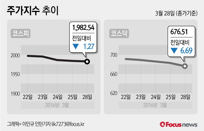 (서울=포커스뉴스) 28일 코스피지수는 전날 보다 0.06%(1.27포인트) 내린 1982.54에 장을 마쳤다. 코스닥지수는 전일 대비 0.98%(6.69포인트) 내린 676.51에 마감했다.