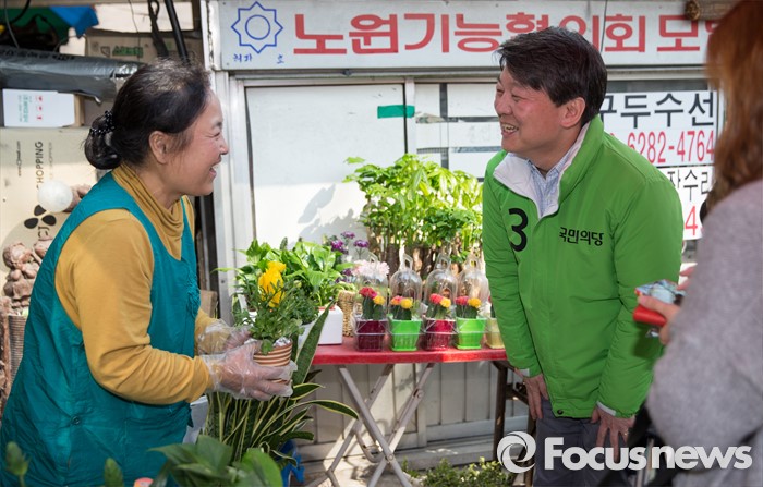 (서울=포커스뉴스) 20대 총선을 16일 앞둔 28일 오후 안철수 국민의당 서울 노원병 후보가 보람상가 앞에서 꽃 가게 상인과 인사하고 있다.