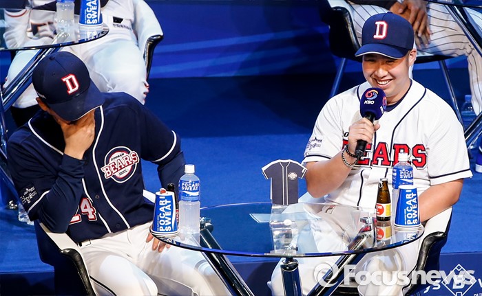(서울=포커스뉴스) 28일 오후 서울 용산구 브루스퀘어 삼성카드홀에서 열린 '2016 타이어뱅크 프로야구 미디어데이 & 팬페스트' 행사에 참석한 두산 베어스 유희관 선수가 팬들의 질문에 답하고 있다.