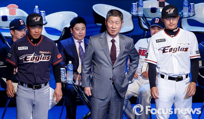 (서울=포커스뉴스) 28일 오후 서울 용산구 브루스퀘어 삼성카드홀에서 열린 '2016 타이어뱅크 프로야구 미디어데이 & 팬페스트' 행사에 참석한 한화 이글스 김성근 감독(가운데)과 정근우, 안영명이 포즈를 취하고 있다.