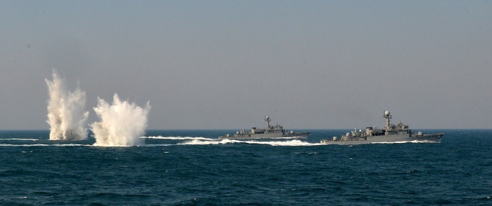 폭뢰투하 훈련하는 해군함정들