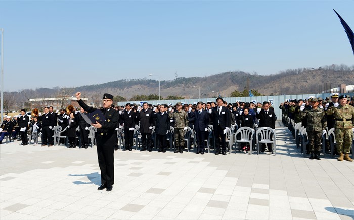 (서울=포커스뉴스) 26일 경기도 해군 2함대사령부에서 열린 '제6주기 천안함 추모식'에서 제주함장 김경환 중령과 2함대 장병들이 해양수호 결의대회를 하고 있다. <사진제공=해군>