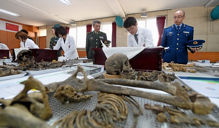 (서울=포커스뉴스) 28일 오후 경기도 파주지역에 마련된 '중국군 유해 임시안치소'에서 지난해 발굴한 중국군 유해 36구에 대한 유해발굴감식단 단원들이 주한중국대사관 국방무관 두농이(가운데) 소장 및 무관단이 참석한 가운데 유해 입관식을 하고 있다.