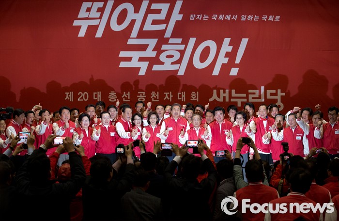 (서울=포커스뉴스) 28일 오후 서울 여의도 국회 의원회관에서 열린 새누리당 20대 총선 공천자대회에 참석한 서울 지역 후보들과 공동선대위원장이 기념촬영을 하고 있다.