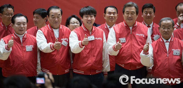 (서울=포커스뉴스) 28일 오후 서울 여의도 국회 의원회관에서 열린 새누리당 20대 총선 공천자대회에 참석한 이준석 서울 노원병 후보와 공동선대위원장이 기념촬영을 하고 있다. 오른쪽부터 강봉균, 김무성 위원장, 이 후보, 서청원, 이인제 위원장.