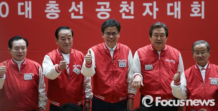(서울=포커스뉴스) 28일 오후 서울 여의도 국회 의원회관에서 열린 새누리당 20대 총선 공천자대회에 참석한 곽상도 대구 동구남구 후보와 공동선대위원장들이 기념촬영을 하고 있다. 왼쪽부터 이인제, 서청원, 곽 후보, 김무성, 강봉균 선대위원장.