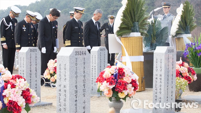(대전=포커스뉴스) 다케이 도모히사 일본 해상막료장(해군참모총장)이 29일 오전 대전 유성구 국립대전현충원을 방문, 천안함 46용사 묘역을 찾아 참배하고 있다.