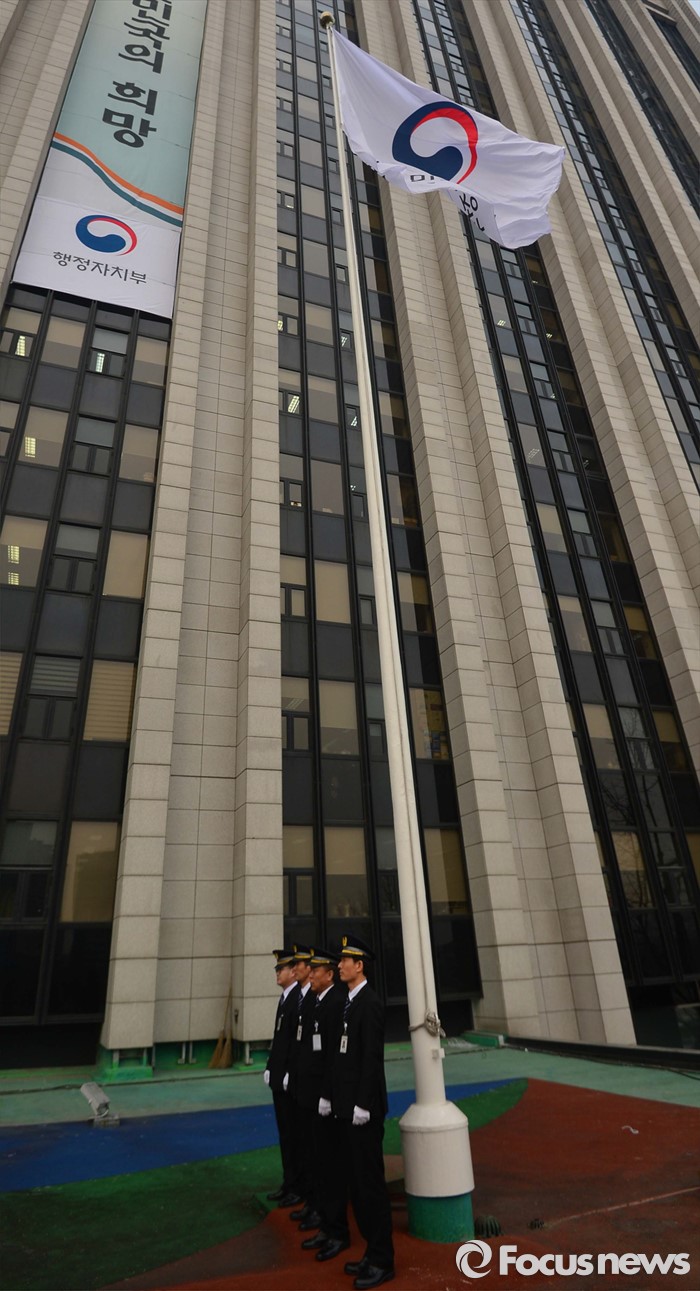 (서울=포커스뉴스) 29일 오전 서울 종로구 정부서울청사에서 대한민국 정부기 게양식이 열렸다. 이날 행사에 참석한 정부 관계자들이 새 태극 도안 정부기를 게양하고 있다. 정부는 67년간 사용해온 '무궁화'에서 '태극' 도안으로 바뀐 새 정부기를 정부세종청사와 서울청사 등 10개 청사에 게양했다.