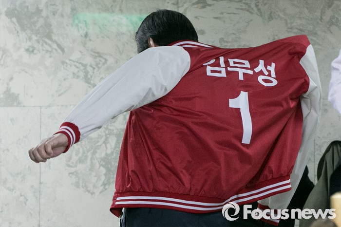 (서울=포커스뉴스) 김무성 새누리당 대표가 29일 오전 서울 여의도 국회에서 열린 첫 중앙선거대책위원회의에 참석해, 선거운동복으로 갈아 입고 있다.