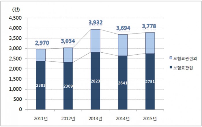 보험료 이의신청은 전년도(2014년) 2641건에 비해 110건(4.1%) 증가해 매년 가입자의 가장 많은 불만요인이 나타나는 분야로 분석됐다.