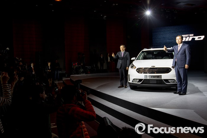 (서울=포커스뉴스) 박한우(오른쪽) 기아자동차 사장과 김창식 부사장이 29일 오전 서울 광진구 쉐라톤 그랜드 워커힐에서 기아차 친환경 소형 SUV '니로(NIRO)'를 공개 하고 있다.