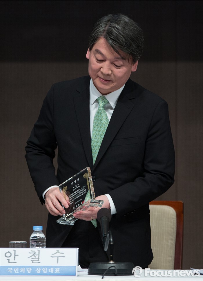 (서울=포커스뉴스) 20대 총선을 15일 앞둔 29일 오전 안철수 국민의당 상임공동대표가 서울 중구 한국프레스센터에서 열린 '안철수 국민의당 공동대표 초청 관훈토론회'를 마친 후 사회자에게 받은 기념패를 들고 서 있다.