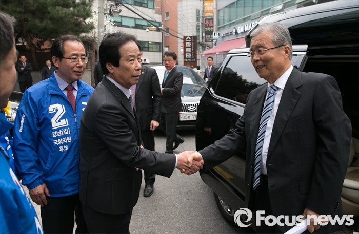(서울=포커스뉴스) 김종인(오른쪽) 더불어민주당 비대위 대표가 29일 오후 서울 강남구 전국개인택시회관에서 열린 전국개인택시연합회 정책간담회에 참석해 유병우 연합회장과 인사하고 있다.