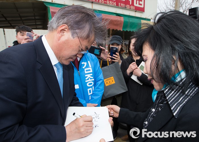(논산=포커스뉴스) 문재인 더불어민주당 전 대표가 29일 오후 충남 논산시 중앙시장을 방문해 시민에게 싸인을 해주고 있다.