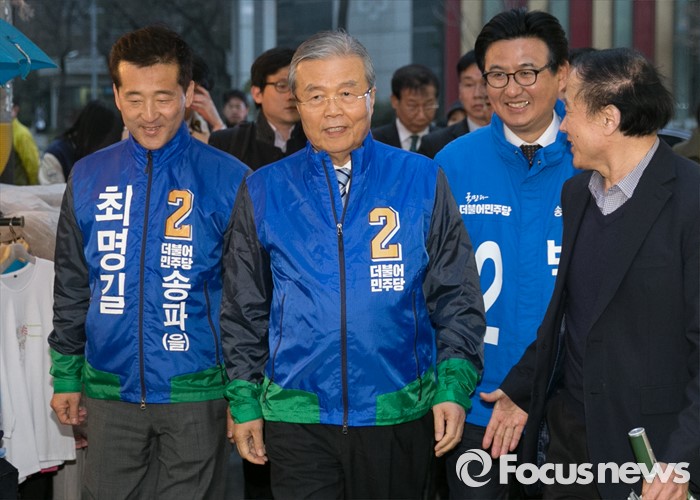 (서울=포커스뉴스) 김종인(가운데) 더불어민주당 비대위 대표가 29일 오후 서울 송파구 새마을시장을 방문해 박성수(오른쪽) 송파갑, 최명길 송파을 후보와 함께 이동하고 있다.
