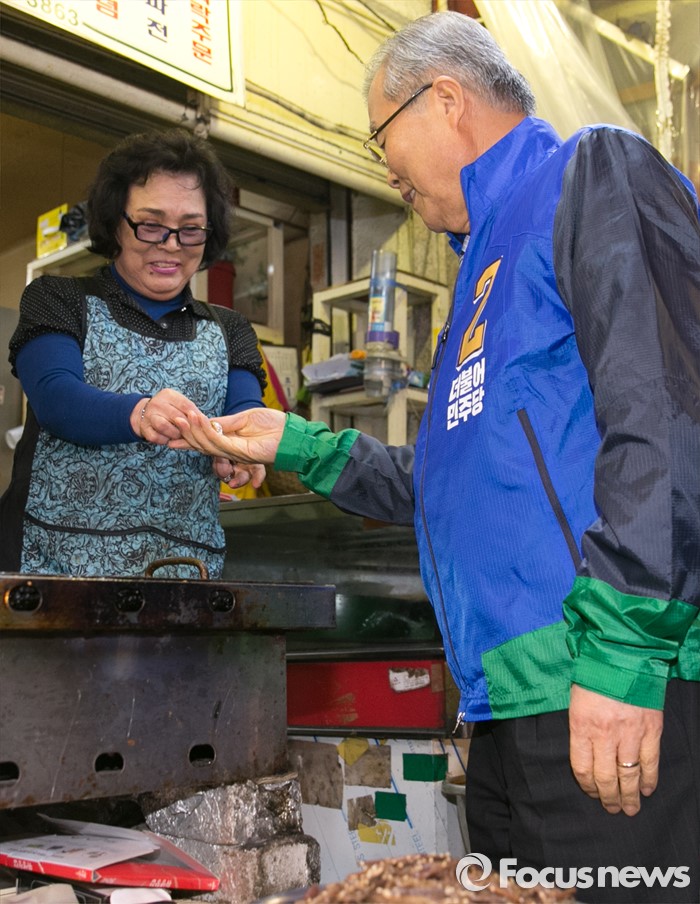 (서울=포커스뉴스) 김종인 더불어민주당 비대위 대표가 29일 오후 서울 송파구 새마을시장을 방문해 한 상인과 인사 후 사탕을 전달받고 있다.